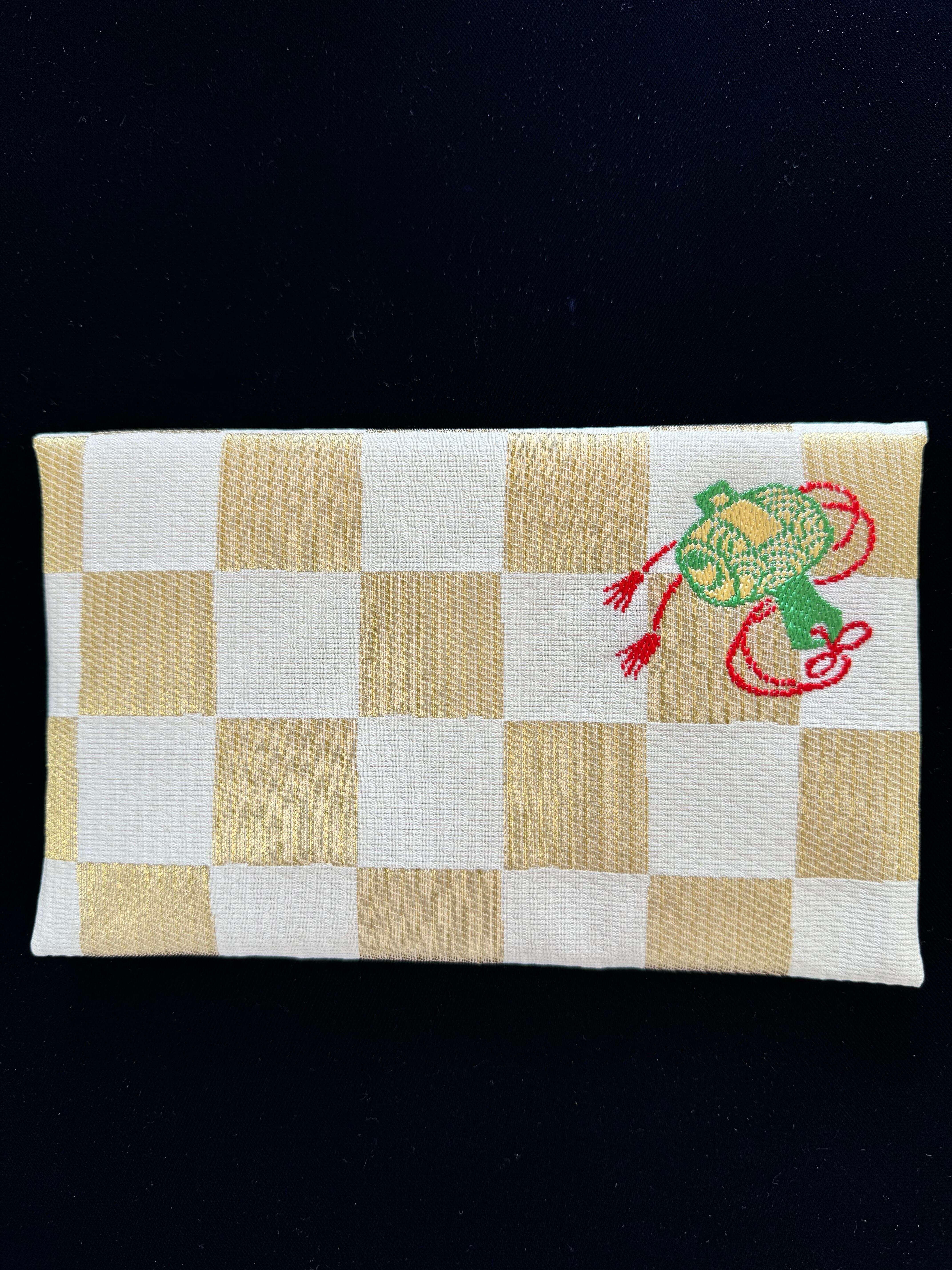 この通帳入れは龍神様の龍、大黒様の打ち出の小槌、金糸が織り込まれており、いつも龍神様、大黒様からの後押しや守って頂けるように願いを込めて作成しております。